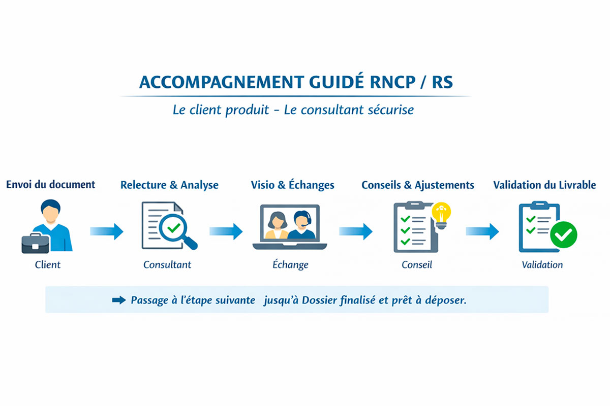 L’accompagnement guidé associe une formation méthodologique RNCP ou RS (finançable selon les dispositifs) et une prestation de conseil distincte, réalisée hors action de formation.